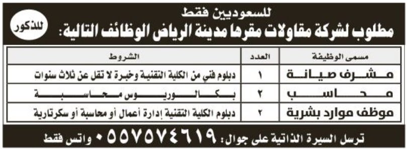 اعلنت شركة مقاولات في الرياض عن وظائف