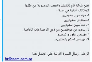 اعلنت شركة تام للانشاء والتعمير المحدوده عن وظائف