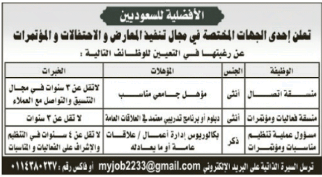 وظائف في #الرياض منسقة اتصال وفعاليات ومؤتمرات ومسؤول عملية تنظيم