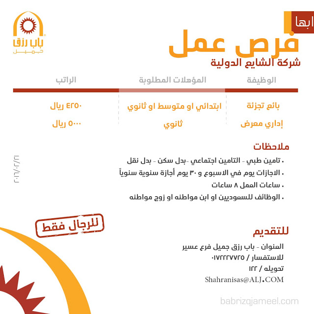 شركة الشايع وظائف في #ابها بائعي تجزئة وإداري معرض رواتب حتى 5000 ريال