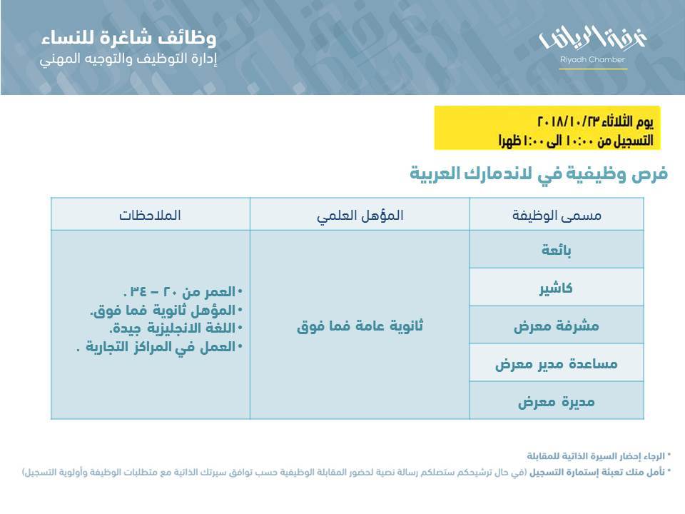 اعلنت شركة لاندرمارك العربية عن وظائف نسائية في الرياض