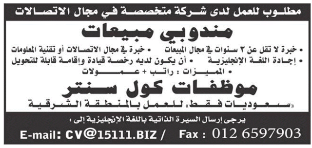 وظائف مندوبي مبيعات وموظفات كول سنتر في المنطقة الشرقية