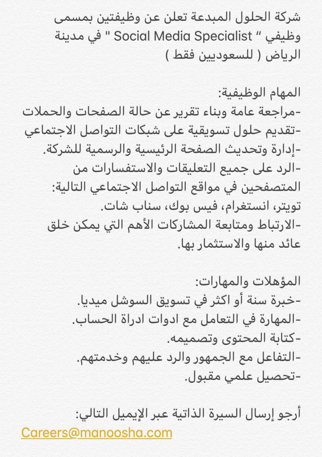 اعلنت شركة الحلول المبدعة عن وظيفتين في الرياض بمسمى