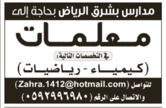 وظائف معلمات كيمياء ورياضيات في شرق #الرياض