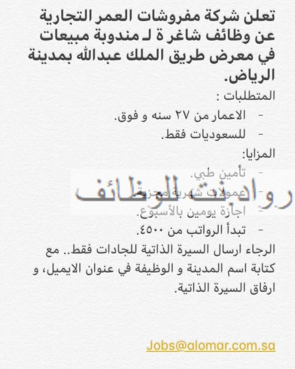 اعلنت مفروشات العمر التجارية عن وظائف شاغرة بمسمى