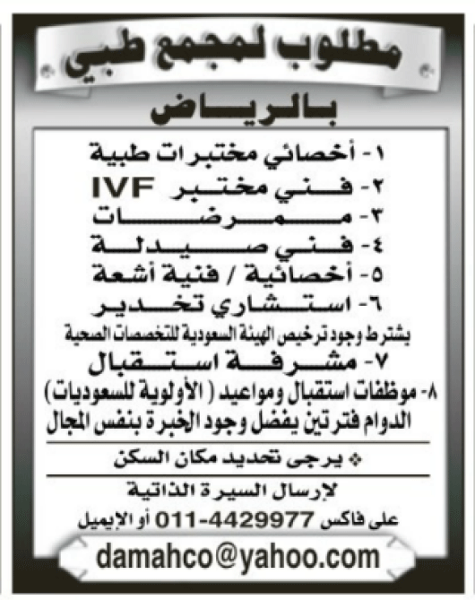 وظائف ممرضات وفني صيدلة واخصائيين واستشاري واستقبال ومواعيد في #الرياض