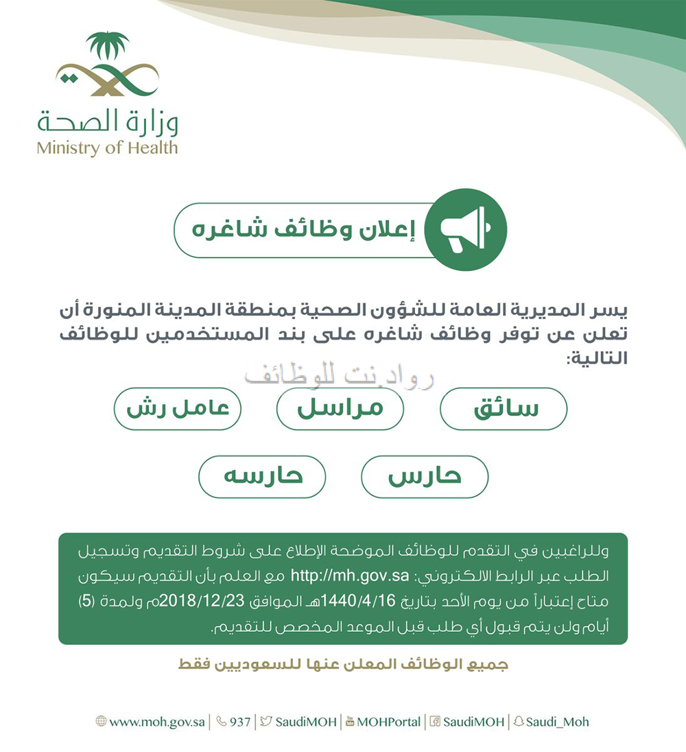 اعلنت صحة المدينة المنورة عن وظائف نسائية ورجالية على بند المستخدمين