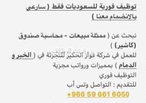 فواز الحكير وظائف نسائية في الخبر و الدمام مبيعات وكاشيرات