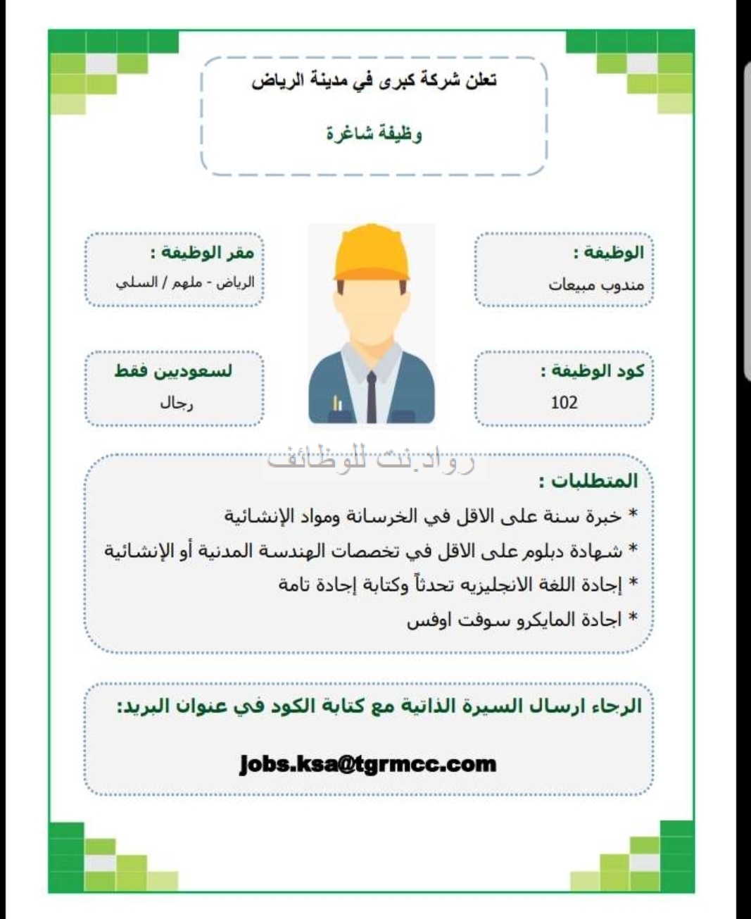 - خبرة سنة على الاقل في الخرسانة ومواد الانشائية