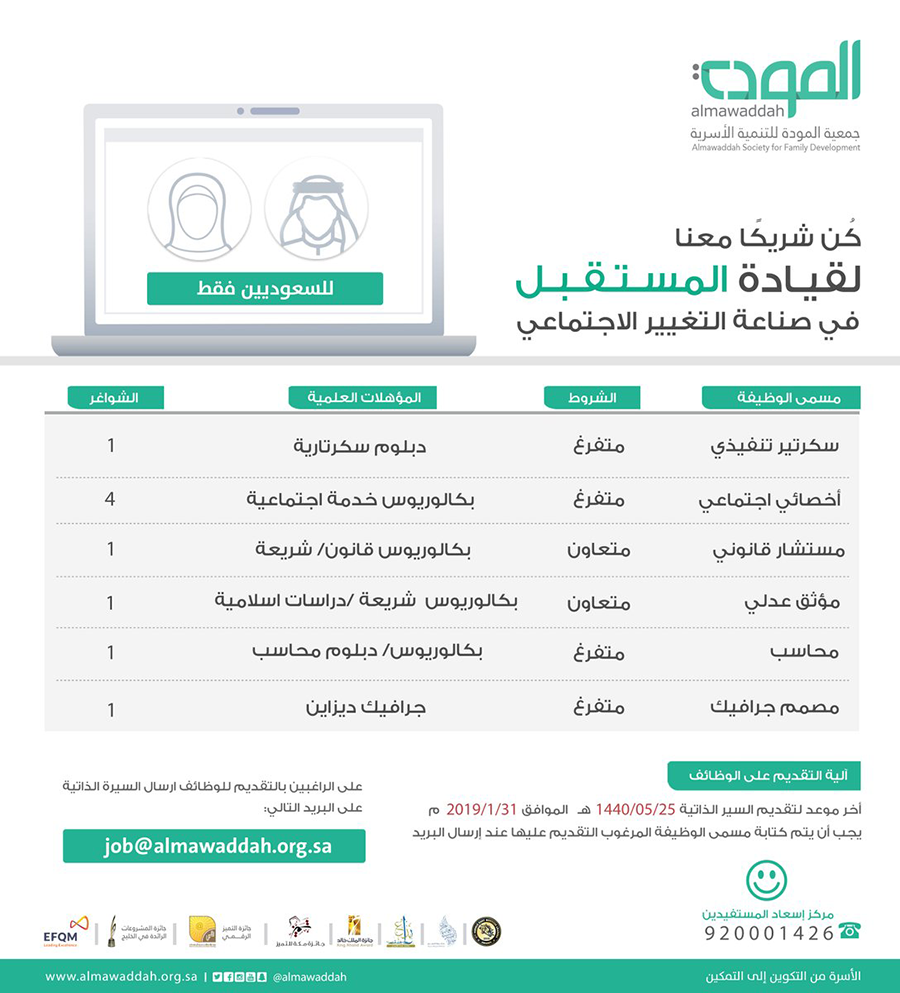 جمعية المودة للتنمية الأسرية في جدة عن وظائف بالمسميات التالية