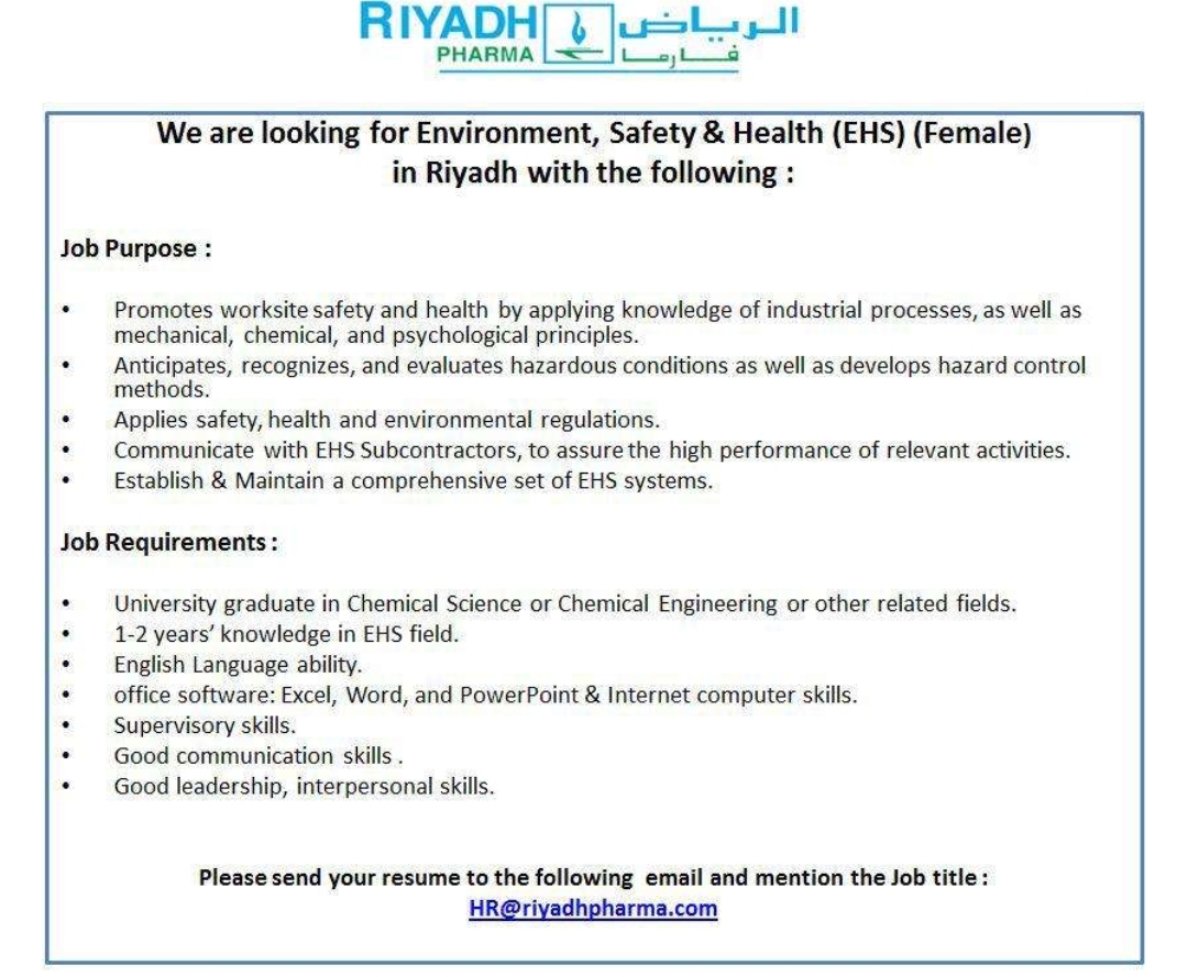 الرياض فارما وظائف لخريجيات العلوم او الهندسة الكيميائية في الرياض