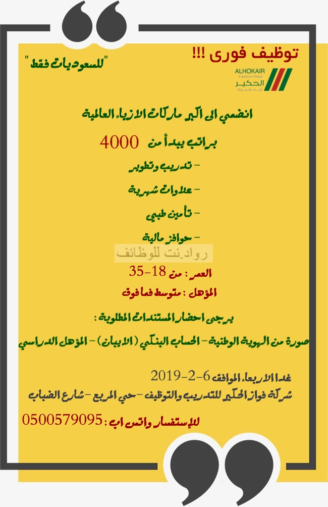 شركة الحكير للازياء تعلن عن وظائف نسائية في اكبر الماركات