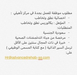 اعلن مركز تأهيلي في جدة عن وظيفة بمسمى