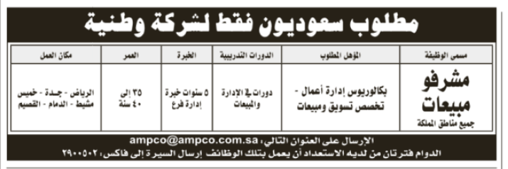 وظائف مشرفين مبيعات في #الرياض #جدة #الدمام #القصيم #خميس_مشيط