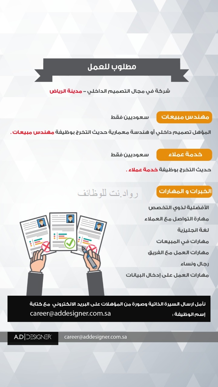 اعلنت شركة تعمل في مجال التصميم الداخلي في مدينة الرياض عن وظائف بالمسميات