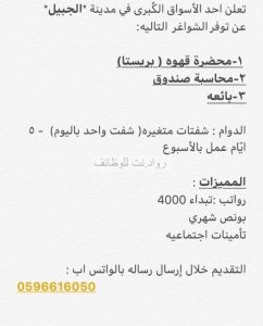 تعلن احد الاسواق الكبرى في الجبيل عن وظائف نسائية بالمسميات التالية