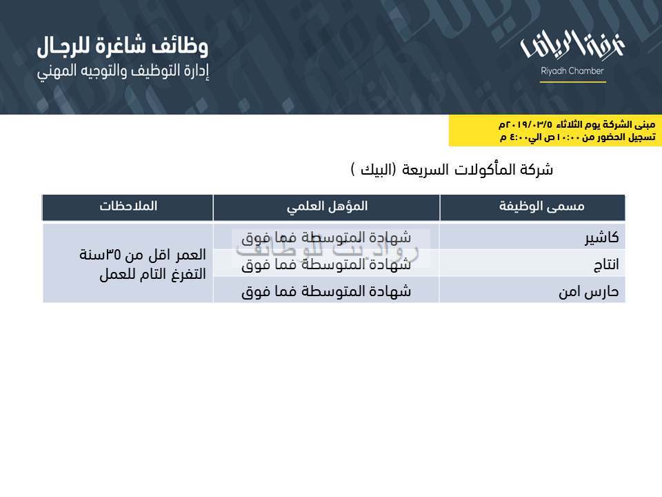 شركة المأكولات السريعة البيك وظائف بالتفاصيل التالية