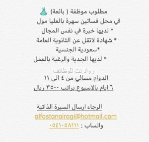 مطلوب موظفة بائعة فساتين سهرة في العليا مول في الرياض