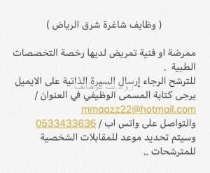 وظائف في شرق الرياض ممرضة او فنية تمريض