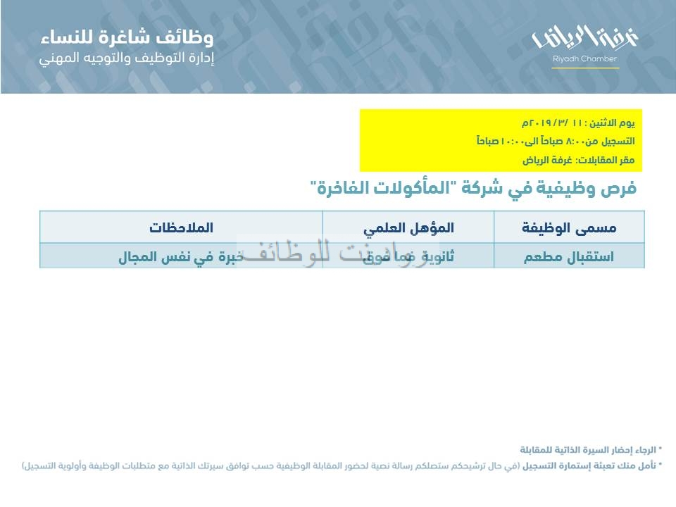 اعلنت شركة المأكولات الفاخرة عن وظائف نسائية وذلك بالتعاون مع غرفة الرياض بمسمى