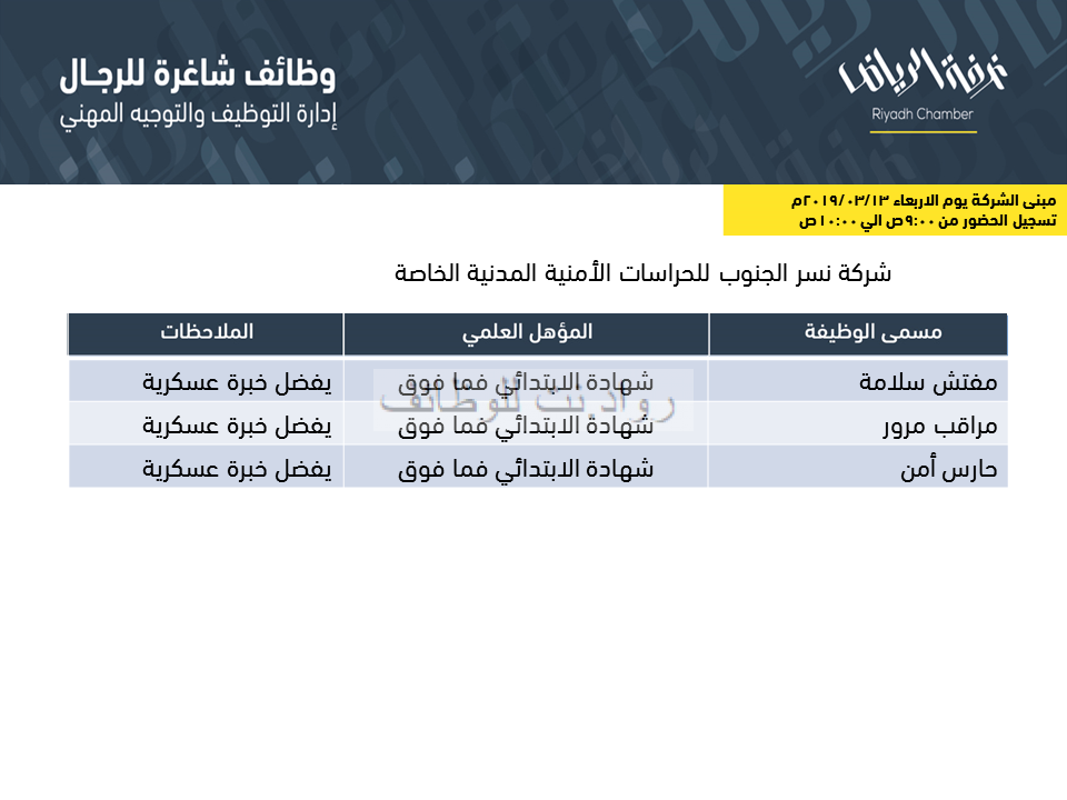 اعلنت شركة نسر الجنوب للحراسات الامنية عن وظائف رجالية وذلك بالتعاون مع غرفة الرياض الوظائف بمسمى