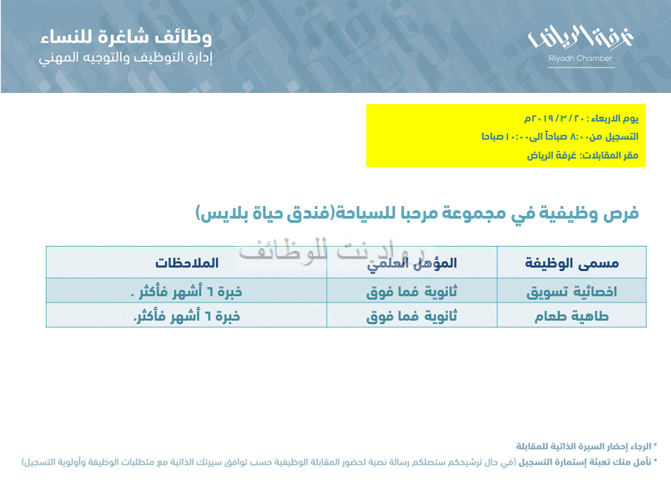اعلنت مجموعة مرحبا للسياحة فندق حياة بلايس عن وظائف نسائية في الرياض بمسمى