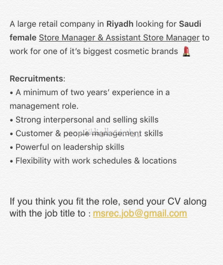 شركة مستحضرات تجميل وظيفة مديرة متجر ومساعدة مديرة في الرياض