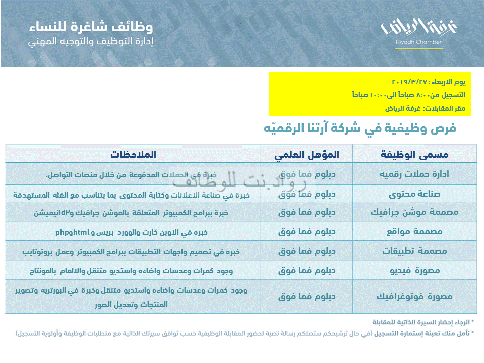 اعلنت شركة ارتنا الرقمية عن وظائف نسائية في الرياض لخريجات الدبلوم / شاهدي وظائف نسائية