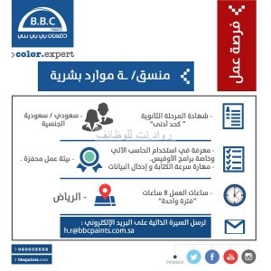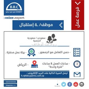 اعلنت شركة دهانات B.B.C عن وظائف نسائية ورجالية في الرياض بالتفاصيل