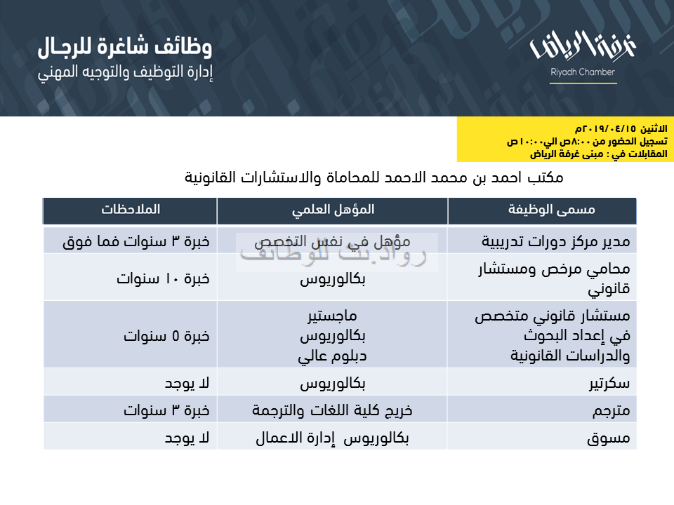 اعلنت غرفة الرياض بالتعاون مع  مكتب احمد بن محمد الاحمد للمحاماة والاستشارات القانونية عن وظائف بالمسميات