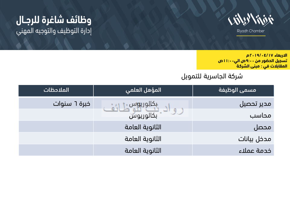 اعلنت شركة الجاسرية للتمويل عن وظائف بالمسميات