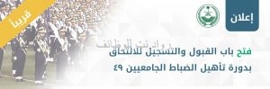 اعلنت ادارة القبول في وزارة الداخلية للشؤون العسكرية عن فتح باب القبول للعام الدراسي (1140/ 1439) و العام الدراسي (1439/ 1438) لحملة شهادة البكالوريوس للالتحاق بدورة تأهيل الضباط الجامعيين رقم (49) بكليه الملك فهد الامنية للعمل بعد التخرج في إحدى القطاعات الأمنية , وسيتم استقبال طلبات التوظيف خلال الفترة من يوم الأحد الموافق 7 / 9 / 1440 هـ الساعة 11 صباحاً إلى يوم الخميس الموافق 11 /9 / 1440هـ الساعة 11 صباحاً
