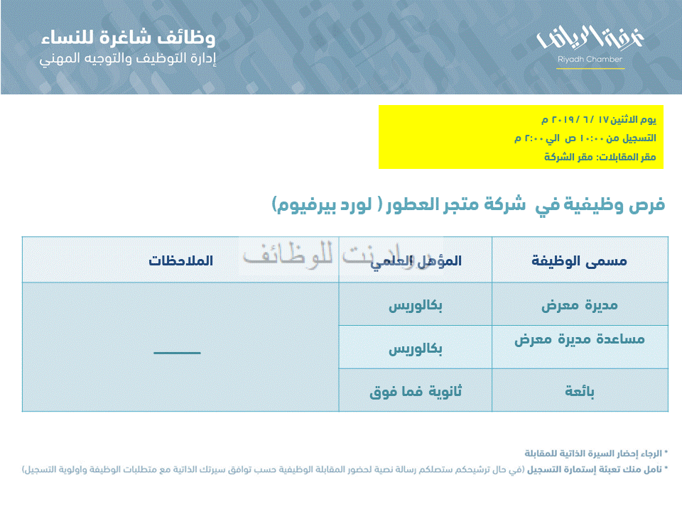 اعلن متجر العطور لورد برفيوم عن وظائف بالمسميات التالية