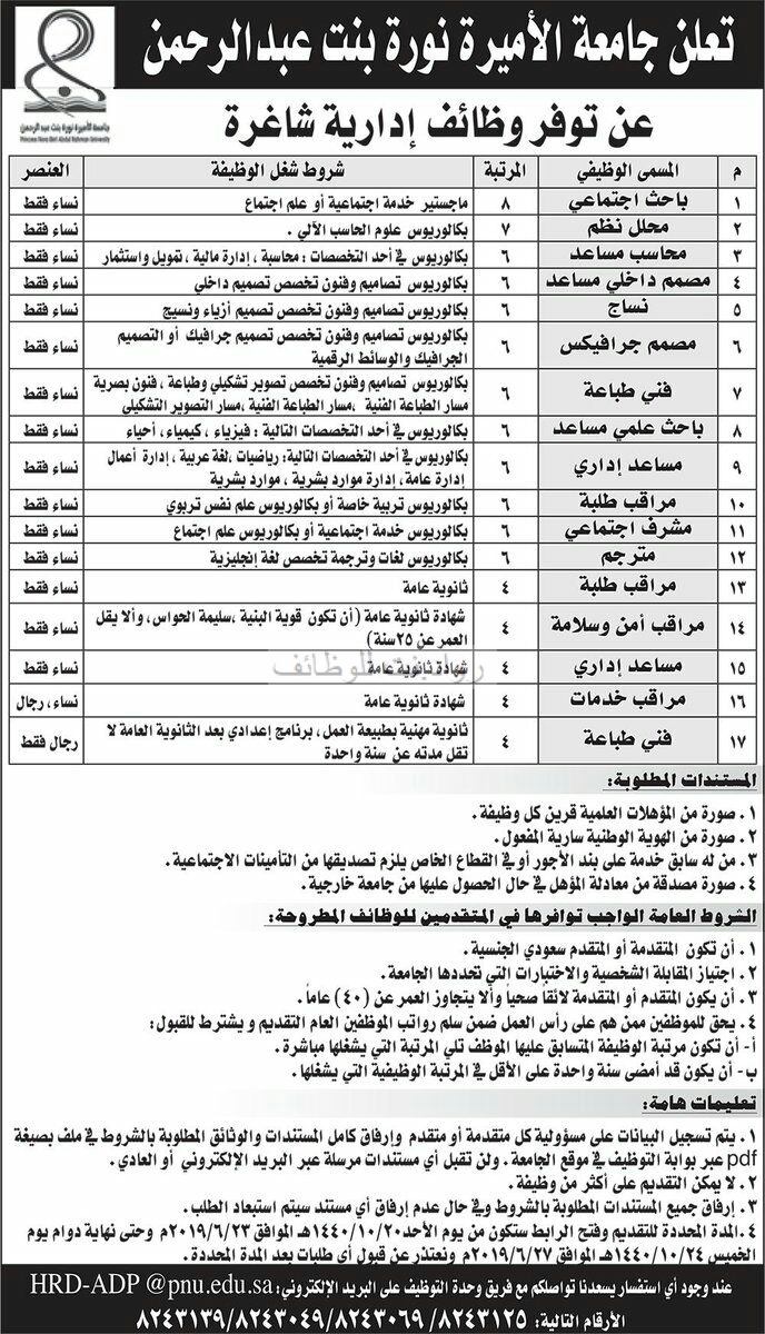 اعلنت جامعة نورة بنت عبدالرحمن عن وظائف نسائية ورجالية إدارية من المرتبة الرابعة حتى الثامنة
