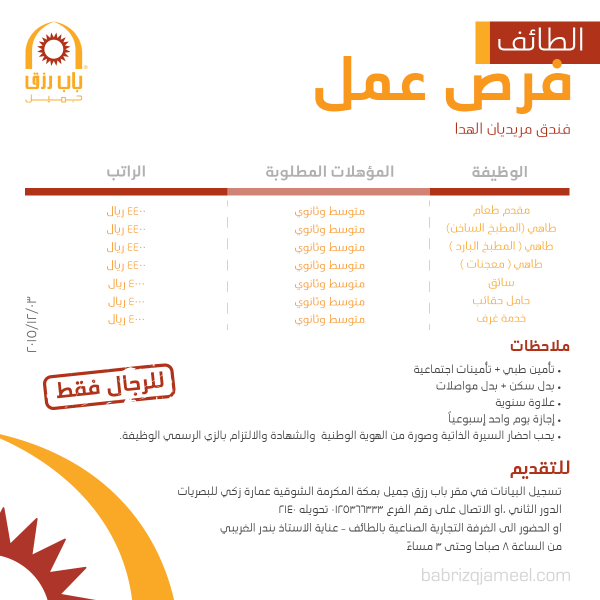 05/12/2015 | أحدث الوظائف اليوم، وظائف الطائف
