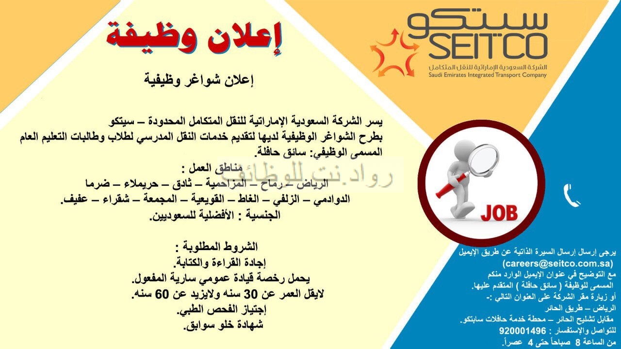 اعلنت شركة السعودية الاماراتية للنقل المتكامل سيتكو عن طرح وظائف بمسمى