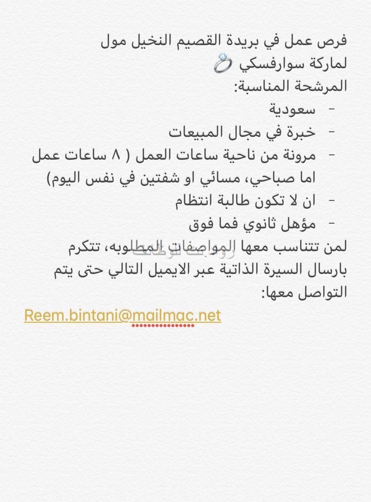 وظائف نسائية شاغرة في ماركة سوارفسكي في #بريدة في المحل المتواجد في النخيل مول