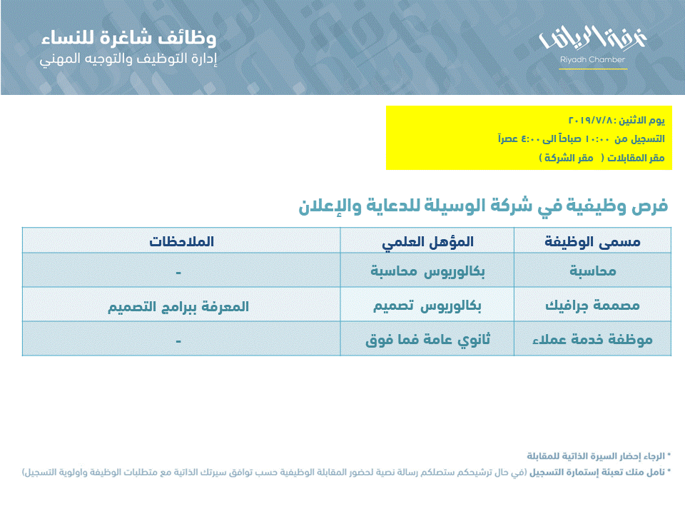 اعلنت شركة الوسيلة للدعاية والإعلان عن وظائف نسائية في الرياض بالمسميات التالية