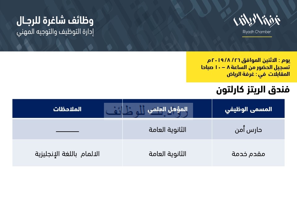أعلن فندق الريتز كارلتون بالتعاون مع غرفة الرياض عن وظائف في الرياض بالمسميات التالية