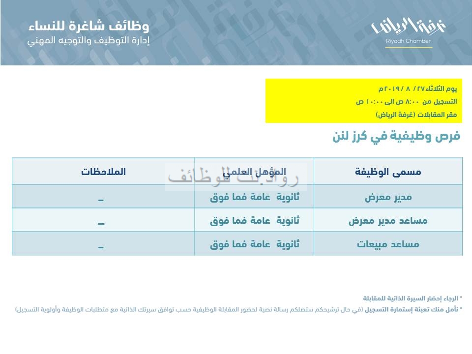 أعلنت شركة كرز لنن عن وظائف نسائية بالمسميات التالية