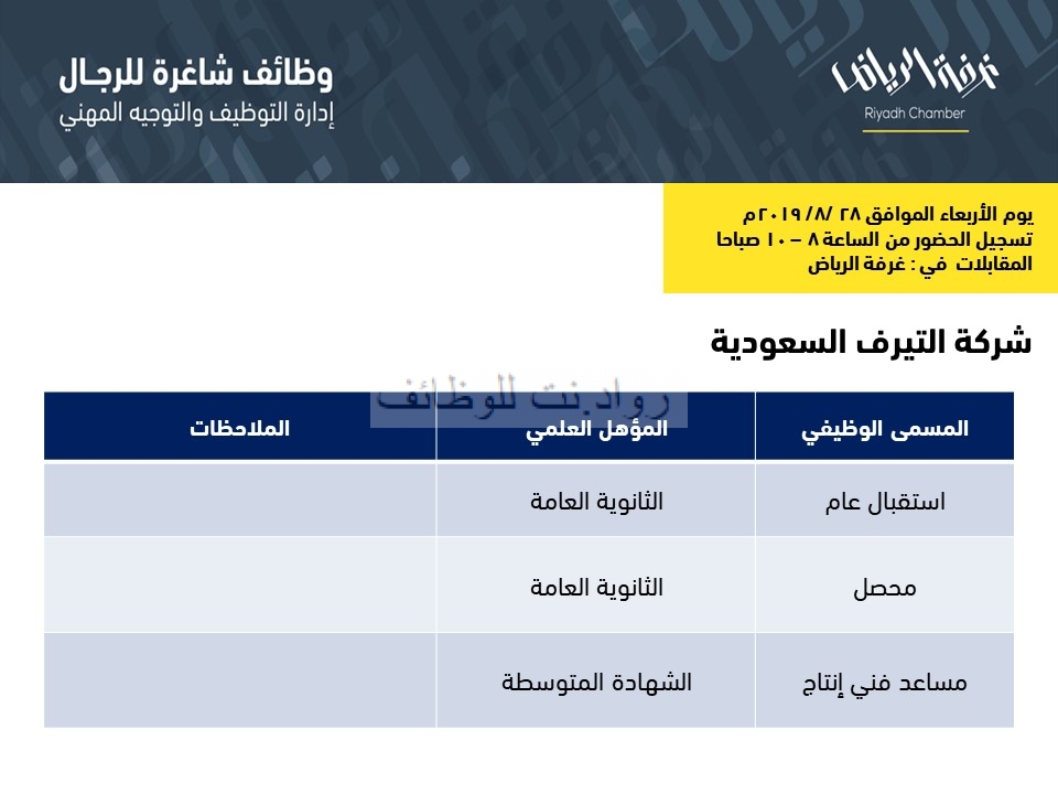 شركة  التيرف السعودية وظائف استقبال ومحصل مساعد فني انتاج