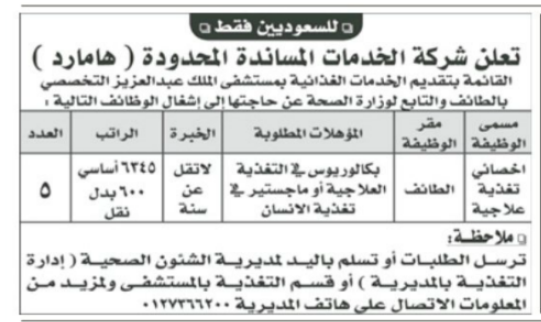 مستشفى الملك عبدالعزيز التخصصي في #الطائف وظائف اخصائيين تغذية