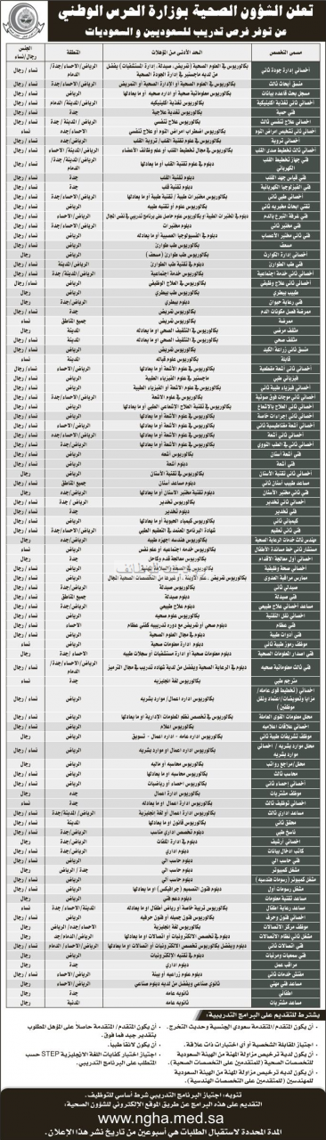 أعلنت الشؤون الصحية بوزارة الحرس الوطني عن وظائف بعدد 300 وظيفة للسعوديين والسعوديات في مجالات الإدارة والفنية والصحية والهندسية وذلك في أغلب مناطق المملكة