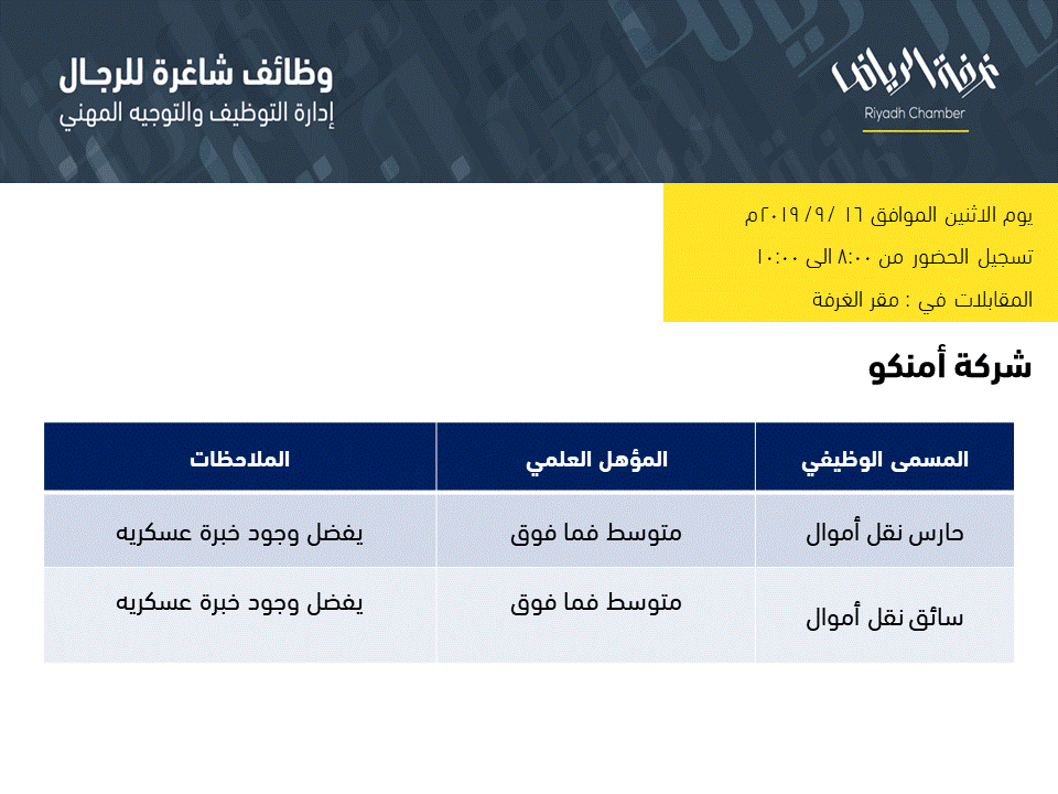 أعلنت شركة امنكو بالتعاون مع غرفة الرياض عن وظائف بالتفاصيل التالية