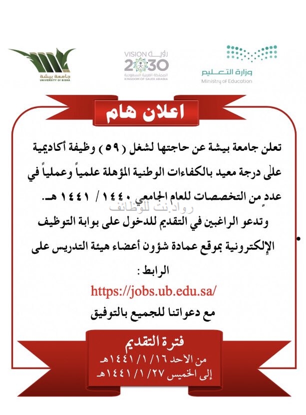 أعلنت جامعة بيشة عن وظائف بعدد 59 وظيفة اكاديمية برتبة معيد