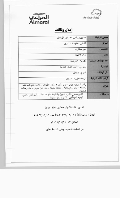 وظائف في  شركة المراعي بالتعاون مع غرفة حفر الباطن عن أكثر من (690) وظيفة شاغرة في الخرج وحائل لحملة الابتدائي والمتوسط والثانوي (رجال) بالمسميات التالية: