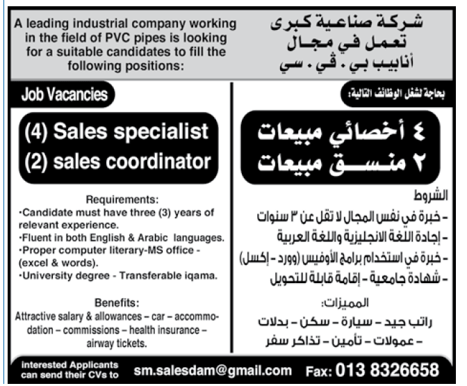 وظائف اخصايين مبيعات ومنسقي مبيعات في الشرقية