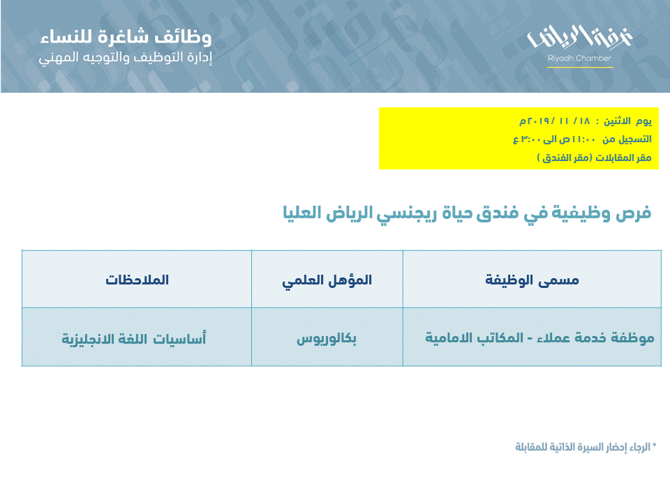 أعلن فندق حياة ريجنسي الرياض العليا بالتعاون مع غرفة الرياض عن وظائف نسائية بمسمى