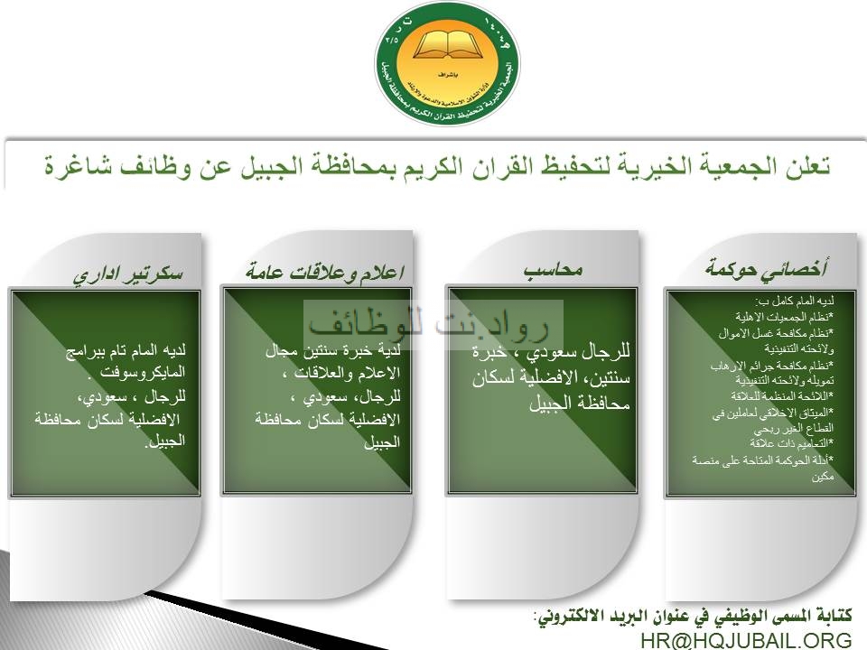 أعلنت الجمعية الخيرية لتحفيظ القرآن الكريم في محافظة الجبيل عن وظائف بالمسميات التالية