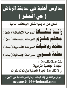 وظائف مدرسين علوم ورائد نشاط ومعلمات رياضيات وعربي في #الرياض